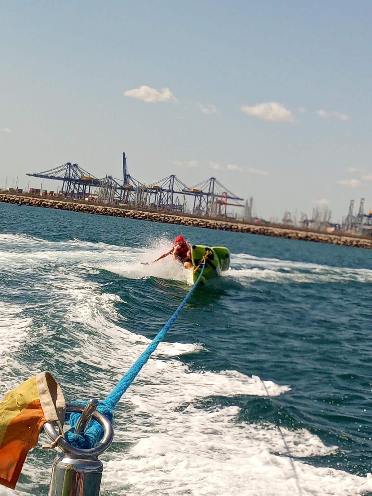 Si nunca has montado en banana boat Valencia prepárate para disfrutar de un rato divertido. La embarcación que que tirara de la banana ira cogiendo velocidad y haciendo curvas de vez en cuando. En las curvas tenéis que hacer contrapeso en la misma dirección de la curva para intentar no caeros al agua. Es como si fueras en moto.